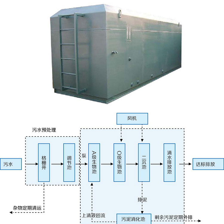地埋式生活污水处理设备 一体化污水处理设备是一种模块化的高效污水生物处理设备,是一种以生物膜为净化主体的污水生物处理系统,充分发挥了厌氧生物滤池、接触氧化床等生物膜反应器具有的生物密度大、耐污能力强、动力消耗低、操作运行稳定、维护方便的特点,使得该系统具有很广的应用前景和推广价值。